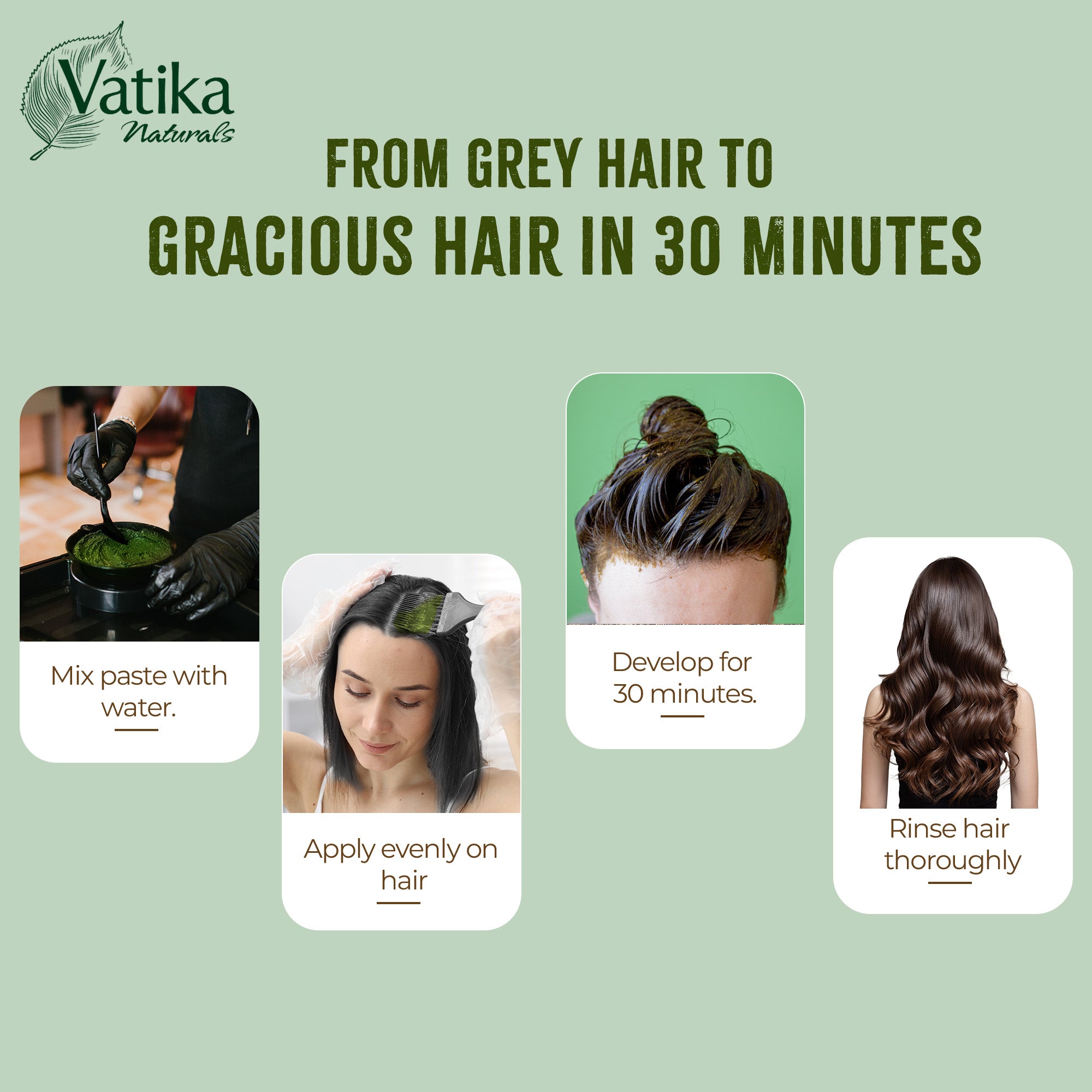 Empty one sachet of Vatika Henna Hair Colour into a bowl. Add 40ml of water and mix to form a uniform paste.Using an applicator brush, apply paste evenly, focus on white hair. Allow colour to develop for 30 minutes. Wash hair thoroughly with lukewarm water. FOR ENHANCED RESULTS - INCREASE FREQUENCY OF USAGE